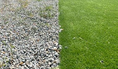 RESTAのプレハブガーデンに、砂利と人工芝を隣り合わせで施工し、雑草の生え方を観察してみました!こちらは雑草が生え始める4月の様子です。砂利の方に雑草が生えていることから、雑草の種子が飛んできて発芽していることがわかります。しかし、人工芝には一切雑草が生えていません。人工芝をすき間なく施工することで高い防草効果が期待できます!