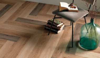 フロアタイル表面のクリア層のみを面取りしているため、タイルの断面が見えず、無垢材に近いナチュラルな仕上がりになります。