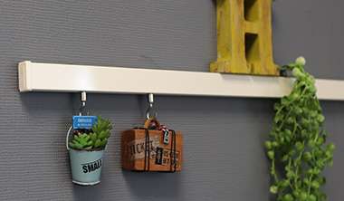 レールの上にも飾れるレールの上部は少し窪みになっていて、お好きな雑貨を飾ることができます。小物やポストカードを置いたり、洋服のハンガーを掛けて、壁面ディスプレイをもっと楽しもう!