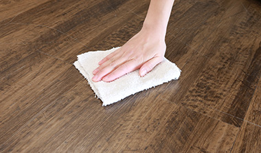 既存の床材の表面の汚れやごみをきれいに掃除し、表面を乾かしてから新しい床材の施工に入ります。既存の床材に浮きや剥がれがある場合や、ノーワックスタイプの床材の場合は、剥がしてから施工します。剥がした後に残ったボンドはスクレーパーで削り落としておきましょう。下地に凹みや穴などがある場合は下地処理材で埋め、サンダーで表面を平らにならし、汚れやごみなどを掃除してから施工に入ります。