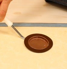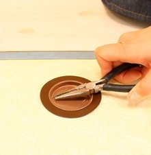 引き手の位置を確認し、指で少し型を付けておきます。次にカッターで切りこみを入れて引き手をはめ込みます。ポンチを当てながら釘を打ち込みましょう。最後にマスキングテープを剥がします。