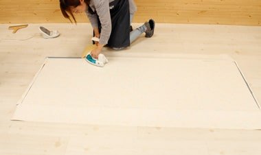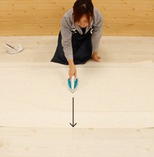 ふすま紙を広げて貼る位置を決めます。上下で位置が変わるような柄のものは、柄合わせラインを目安にして位置を合わせましょう。ふすま紙の位置がズレないように注意しながら、ふすま中央から縦方向にアイロンをあてます。次に中央から横方向にアイロンをあてましょう。
