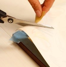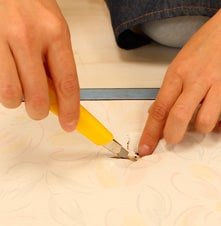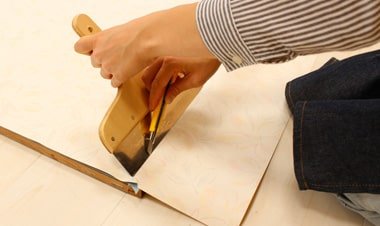 ふすま紙がしっかりと貼付けできたら、余分な切りしろをカットします。地ヘラをふすま枠の縁に押し当ててカッターでカットします。この時に下地のふすま紙まで切らないように注意しましょう。カットした部分は再度アイロンを当てて切りしろを取り除きます。