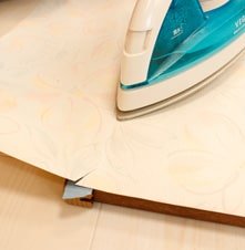 あとはふすま紙全体にアイロンをあてて貼り付けます。アイロンのあて残しの無いように、まんべんなく均一にあてましょう。また、四隅の角に切り込みを入れて、枠のふちにアイロンのヘリを押し当てながらきめ込みます。最後にふすまの周囲にアイロンをしっかりあてましょう。