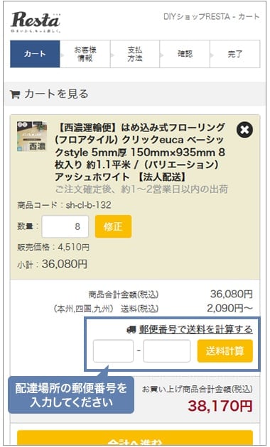 ご確認いただけます対象商品をカートに入れ、カートで郵便番号を入力することで、送料の自動見積もりができます。初期状態では、最安地域の送料が表示されています。ログインしている場合は、最後に選択した送付先への送料が表示されます。