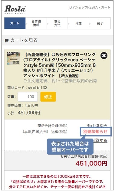 赤文字でエラーが出ます一度に注文できるのは1000kg分までです。「別途お知らせ」と表示される場合は重量オーバーですので、分けてご注文いただくか、チャーター便の利用をご検討ください。