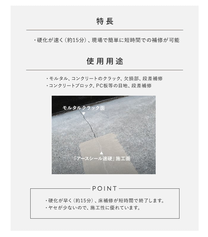モルタル・コンクリート床の欠損部補修に。硬化が速く(約15分)、現場で簡単に短時間で補修ができます。