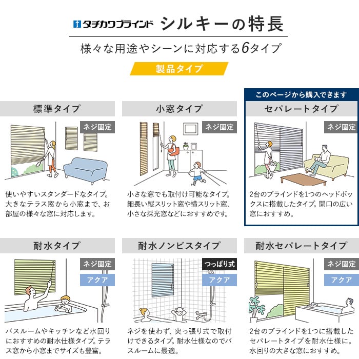 国内有名メーカー タチカワブラインドが製造するアルミブラインド「シルキー」シリーズ。確かな品質と種類豊富なスラットで使う場所を選びません。