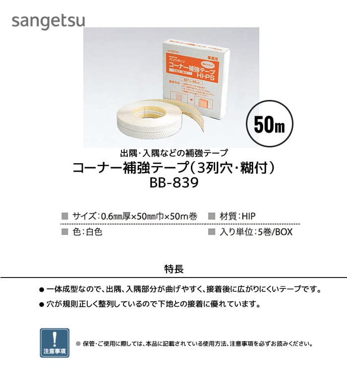 出隅・入隅などの補強テープ コーナー補強テープ (3列穴・糊付) 50m