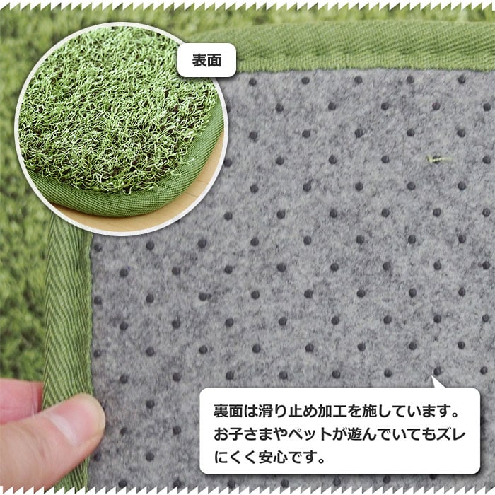 室内のお部屋にいながら、アウトドア気分を味わえる芝生風ラグ。裏面は滑り止め加工付き。