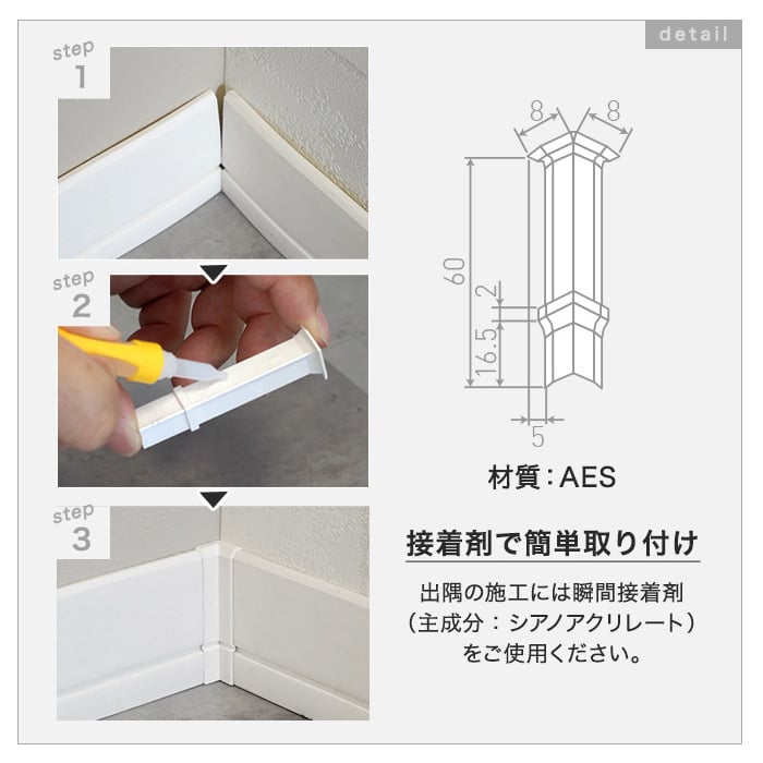 出隅の施工には瞬間接着剤 (主成分: シアノアクリレート) をご使用ください。