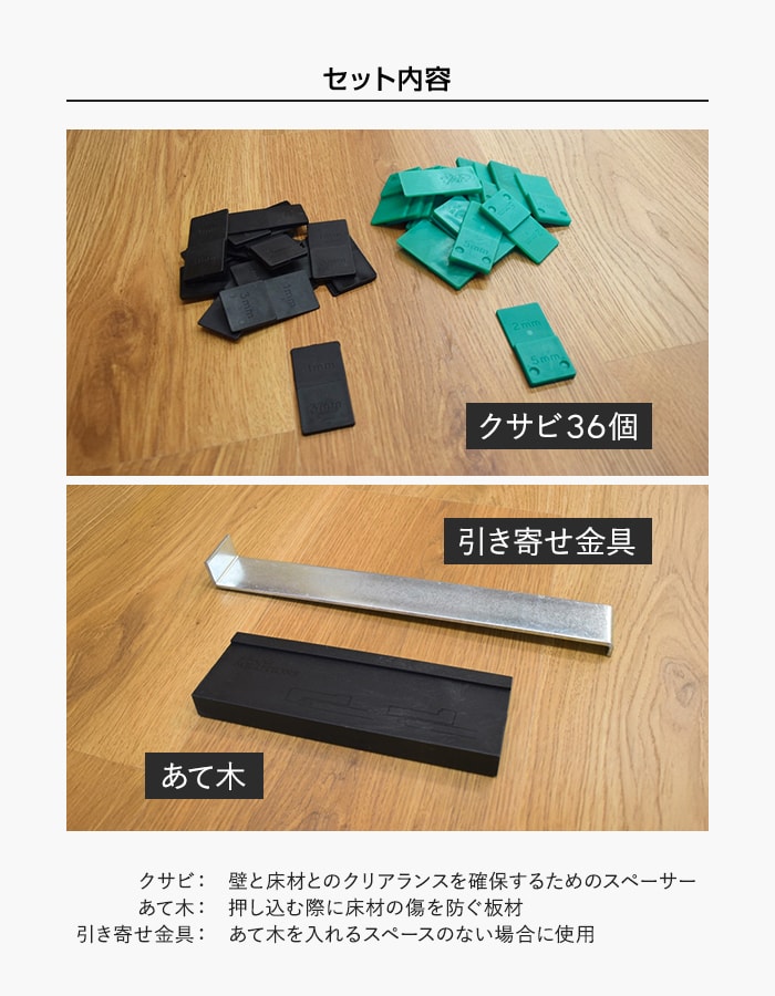 施工キットでは、壁際と床材の適切な隙間を確保するクサビや、床材を傷つけずはめ込むことができる当て木等、施工に必要な細かな道具をまとめてご購入いただけます。
