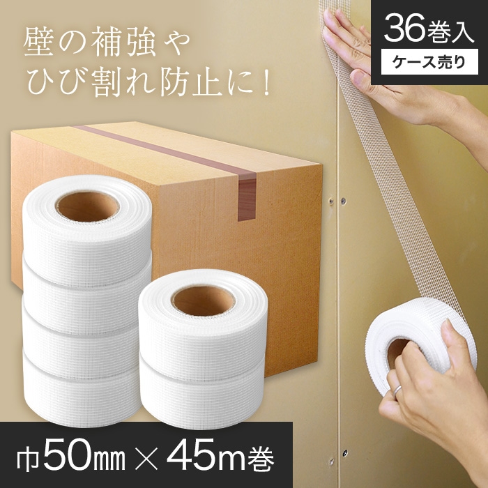 別名「寒冷紗」とも呼ばれるメッシュ状の粘着テープです。強度・寸法安定性に優れたグラスファイバー(ガラス繊維)素材で、石膏ボードの下地の継ぎ目補強や亀裂の補修に 最適!網目の形状、弱粘着剤付きで下地に接着しやすく、直接ボードの目地部分に貼る ことができます。
