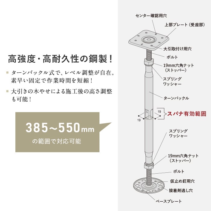 高強度・高耐久性の鋼製。ターンバックル式でレベル調整自在!屋内用・木造住宅用の鋼製機能束です。