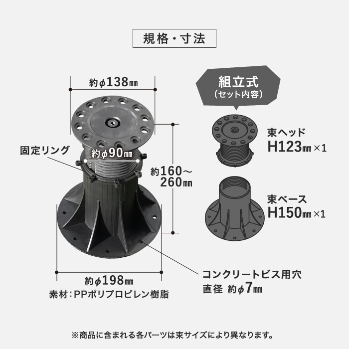 束石いらずの安定性でウッドデッキに最適! 樹脂束 (プラ束) 160-260mm