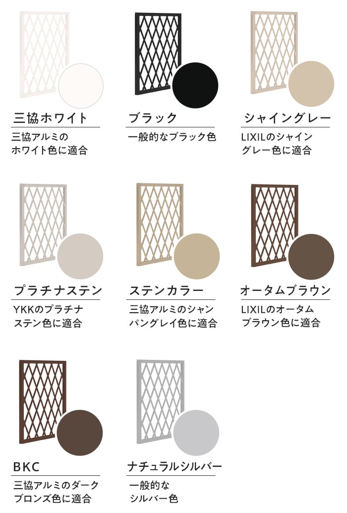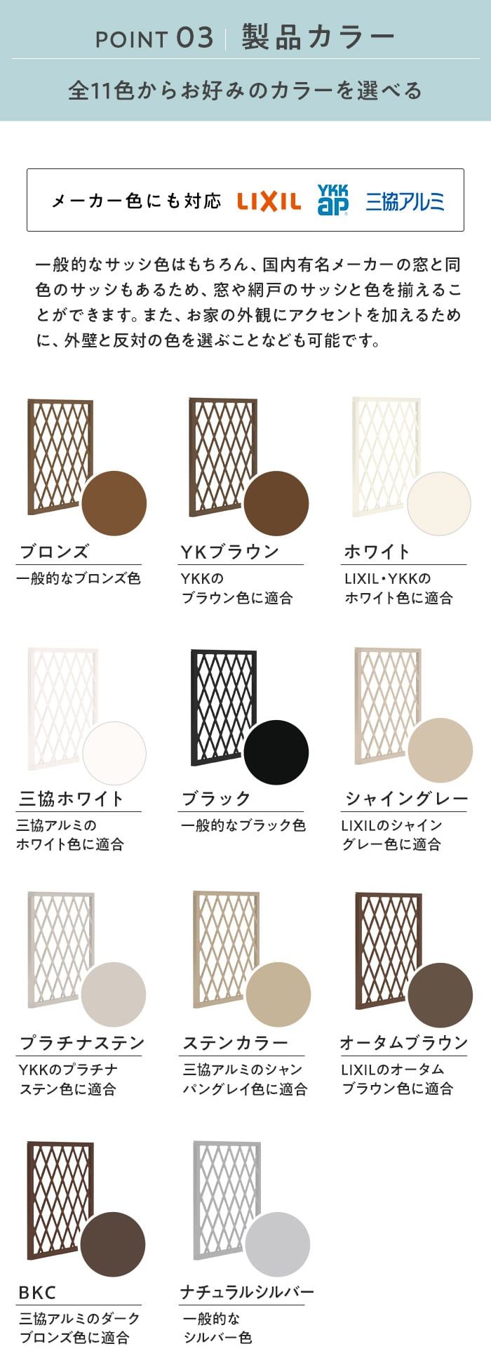 一般的なサッシ色はもちろん、国内有名メーカーの窓と同色のサッシもあるため、窓や網戸のサッシと色を揃えることができます。