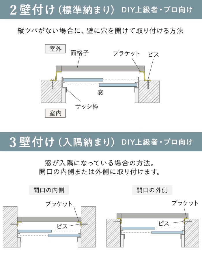 ・サッシ枠付け※サッシに「縦ツバ」 がある場合はブラケットを打ち込むだけで設置できます。
