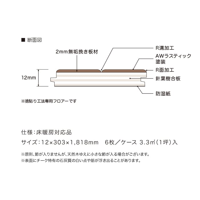 表面に2mmの天然木単板を使用した挽き板フローリング。チークは世界三大銘木の一つと称される高級木材で、使い込むほどに色の深さやツヤが増し美しく変化します。ゴージャスでエレガント、格調高い部屋作りにおすすめです。