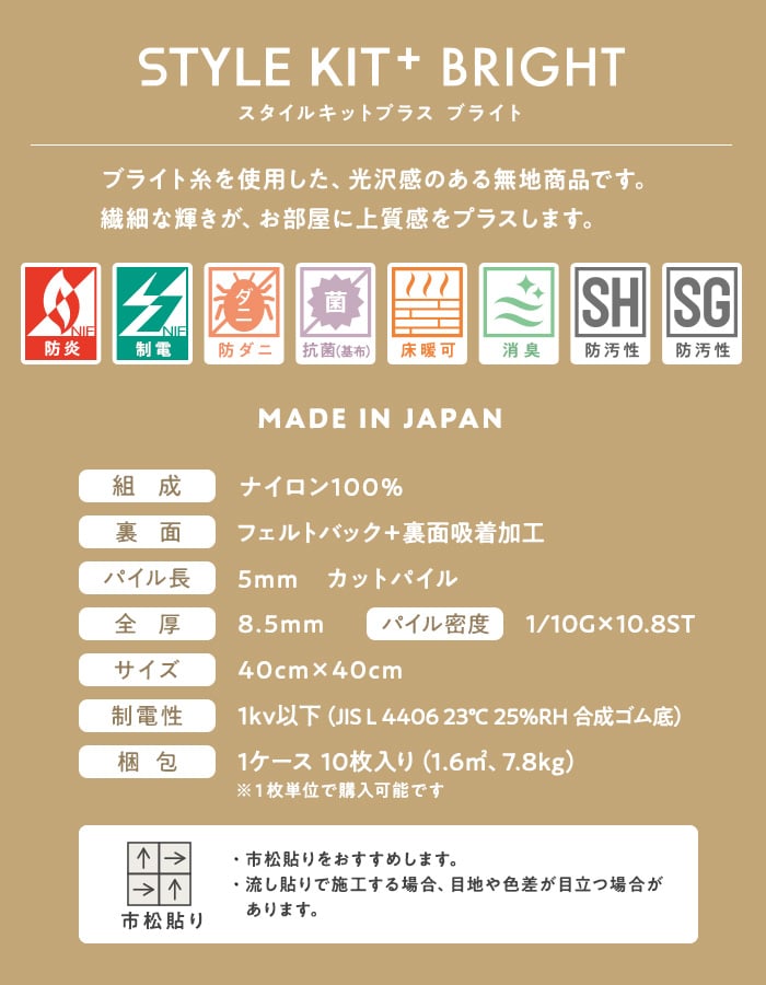 タイルカーペット サンゲツ 床暖房対応 消臭 洗える STYLE KIT+BRIGHT 40×40cm