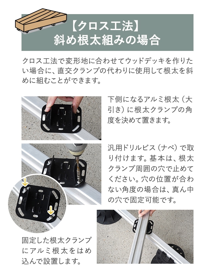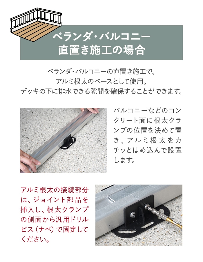 アルミ根太を使ったベランダの直置き、クロス工法の斜め施工に!