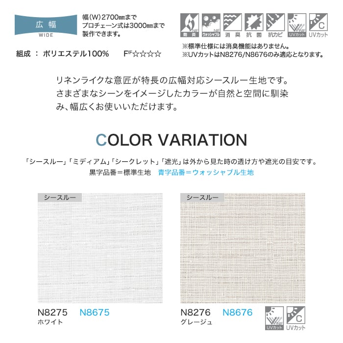 グレージュのみUVカット機能があり、紫外線を反射しフローリングや家具の日焼けによる劣化を防止します。