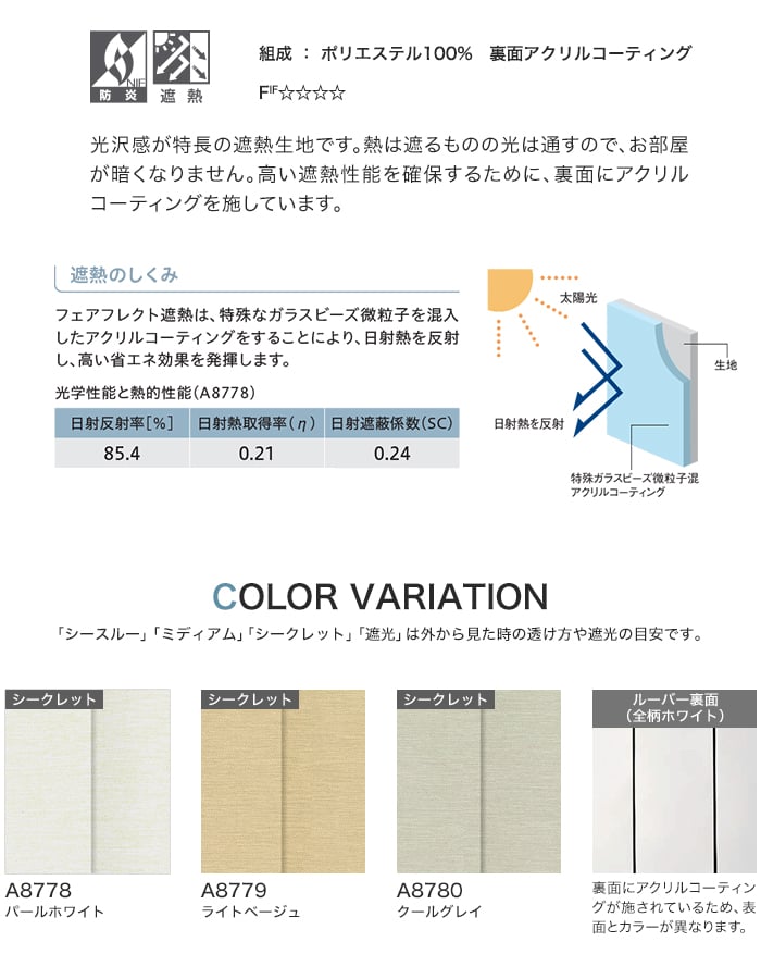 〇遮熱:特殊な糸の効果や特殊な加工により日射熱を反射し、遮熱効果を高めたスラットです。