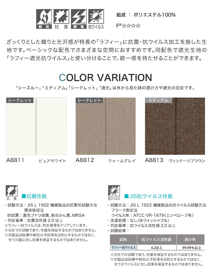 ざっくりとした織りと光沢感が特長の「ラフィー」に抗菌・抗ウイルス加工を施した生地です。