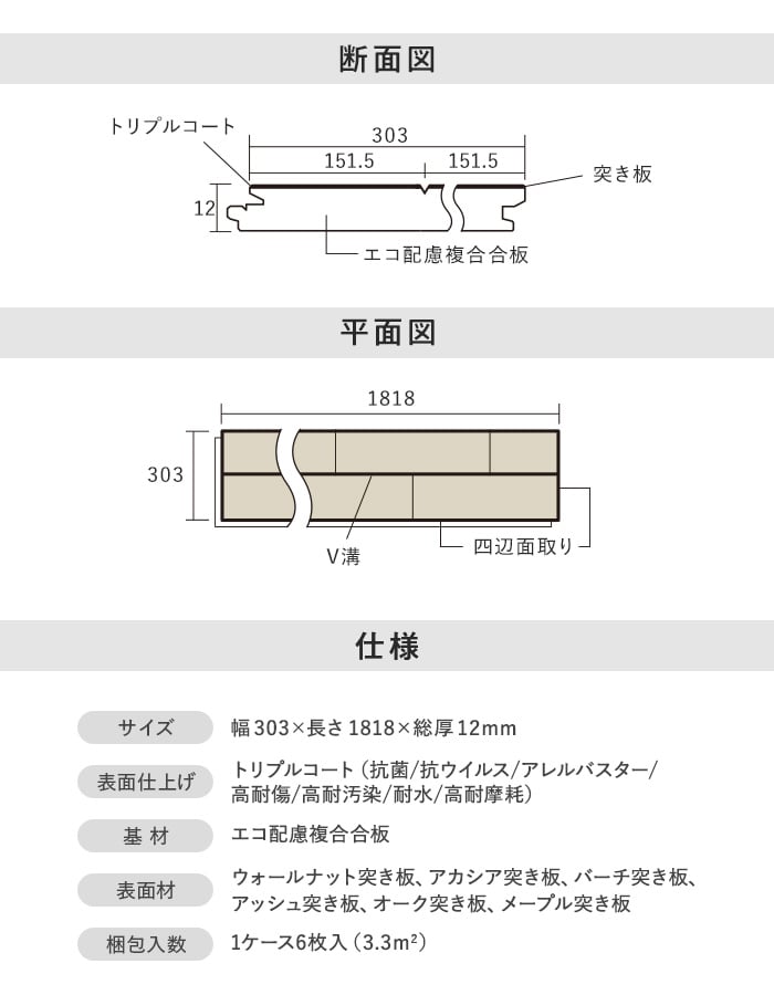 ●表面仕上げ:トリプルコート(抗菌/ 抗ウイルス/アレルバスター/ 高耐傷/高耐汚染/ 耐水/ 高耐摩耗)