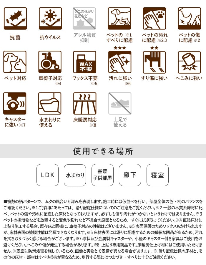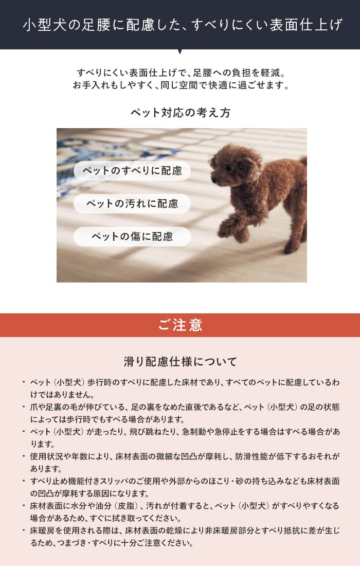 既存フローリングに上貼りできる薄型リフォーム用床材。ペットの傷や、滑りに配慮した仕様です。