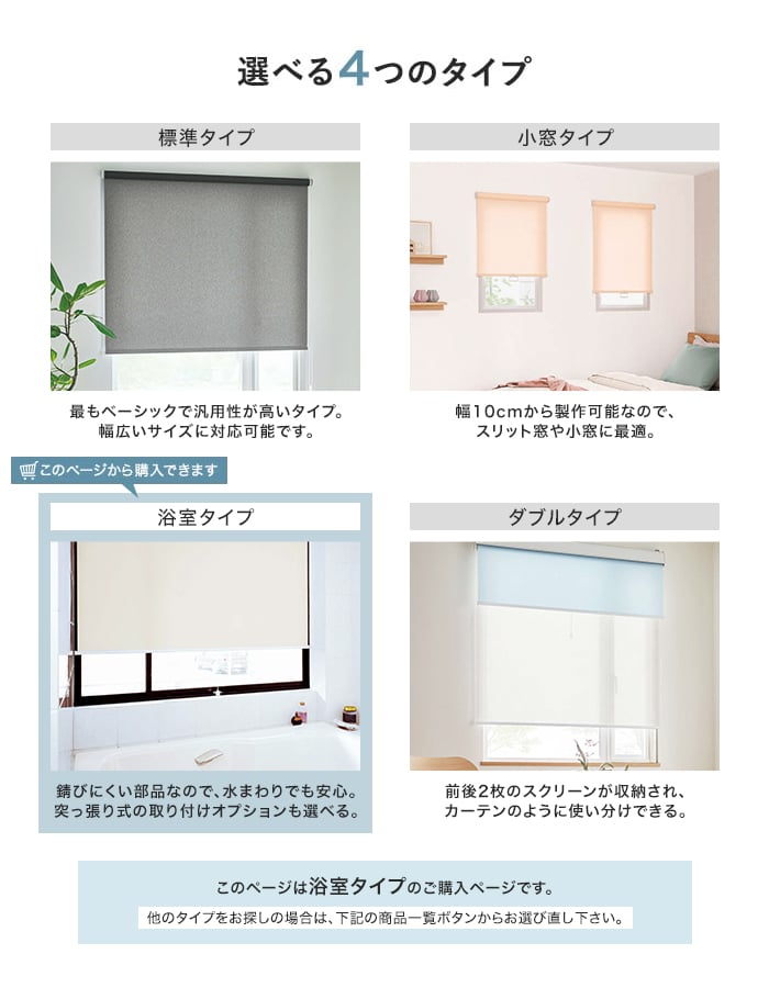 浴室用TOSOロールスクリーン「ティーナ」。錆に強い素材を使用し、水がかかる場所でも安心。浴室専用生地を採用。