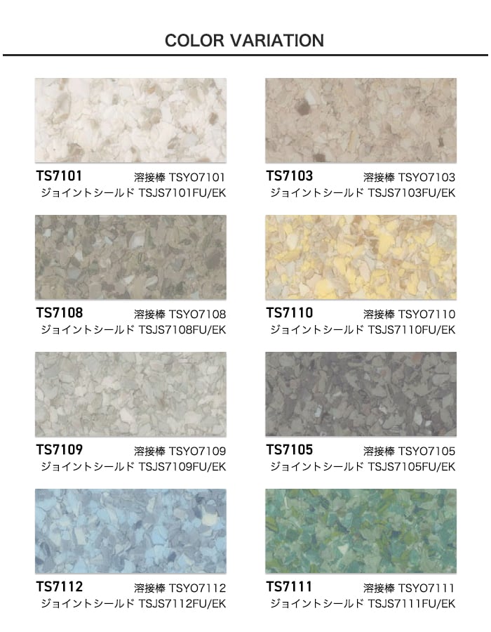 ○高耐動荷重:工場など重量物を積載したハンドリフトや、手術室の電動手術台などが常に往来するような場所に対して、指定された接着剤を用いることによって優れた耐動荷重性を示します。