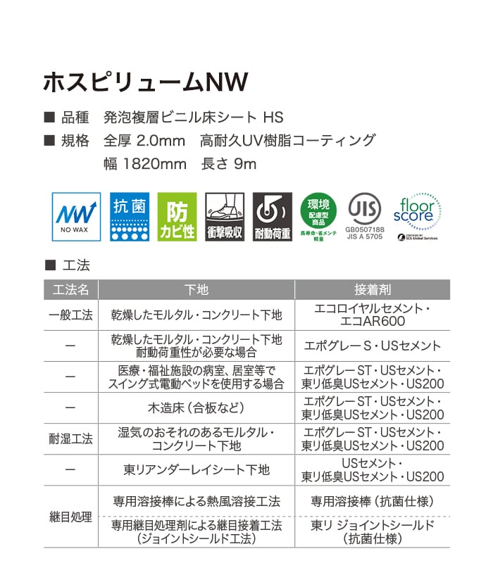 ○NO WAX:長期間ワックスメンテナンスが不要な床材です。日常清掃だけで、永く美観を維持できます。