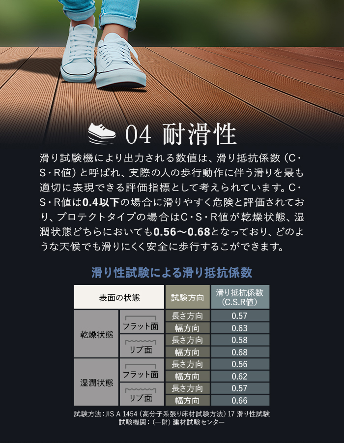 機能性:耐水性・耐候性・耐滑性・帯電防止性・耐汚染性など