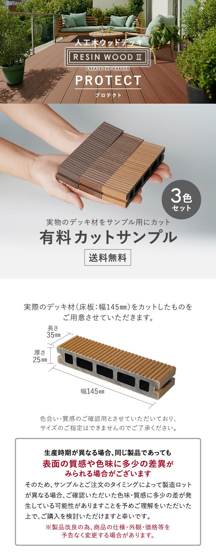 人工木ウッドデッキ RESINWOOD2 プロテクト 床板 カットサンプル 3色セット