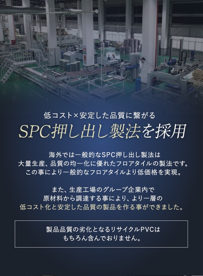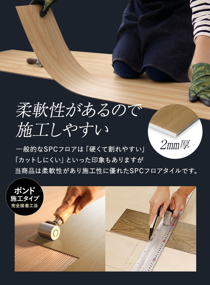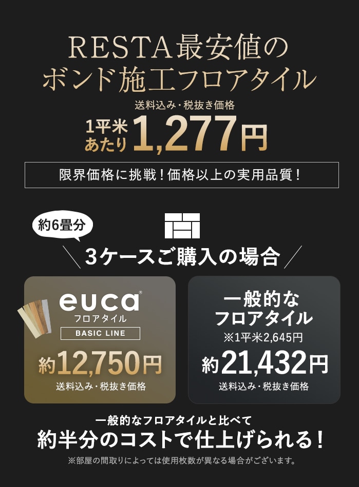 SPC押し出し製法を採用し限界価格に挑戦!一般的な国内メーカー製品と比べて約半分のコストで仕上がるRESTA最安のボンド施工フロアタイルです。