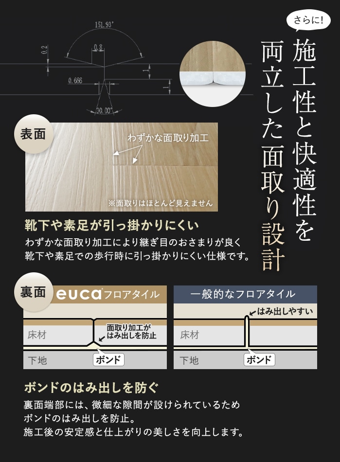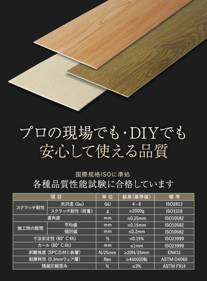 ISO規格に準拠した各種性能試験をクリア、施工性と使用感を考慮した面取り加工、さらに土足対応の耐摩耗性など、プロの現場でも、DIYでも、安心して使える品質にもこだわりました。