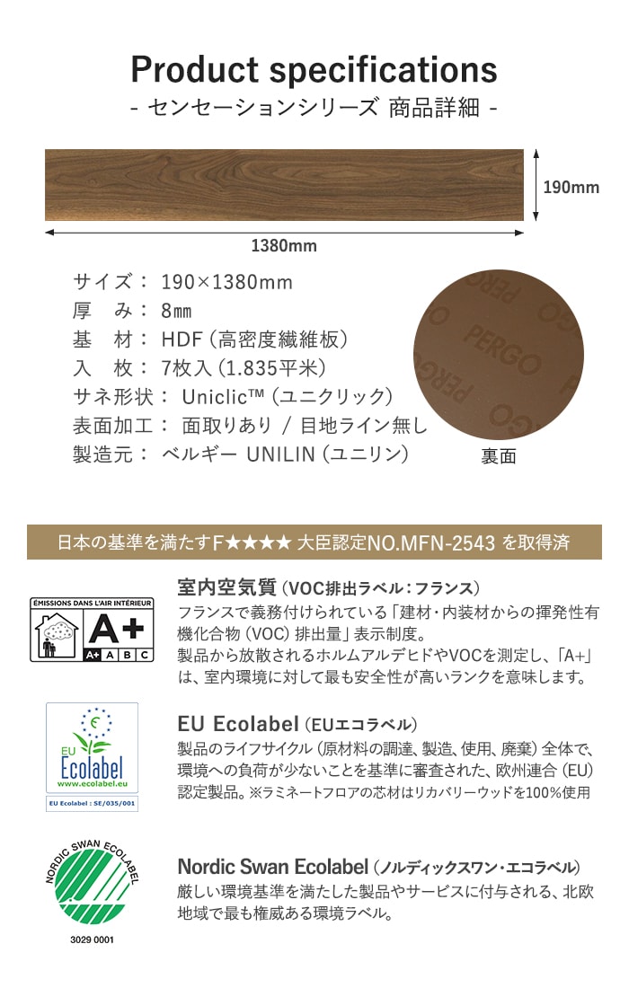 はめ込み式フローリング ペルゴラミネートフロア センセーションシリーズ 8mm厚 190×1380mm 7枚入 約1.84平米
