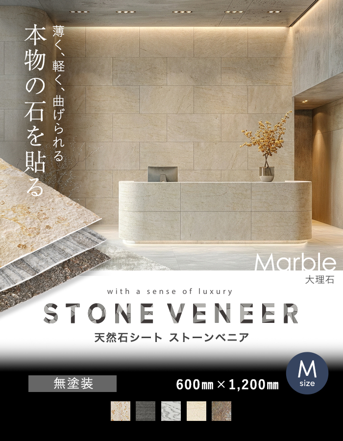 ストーンベニアは、天然の石材を特殊な技術で薄く剥がした新しくて地球環境に優しい天然石シートです。