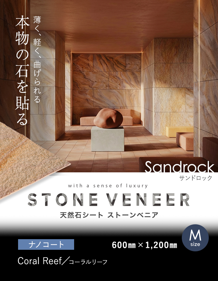 ストーンベニアは、天然の石材を特殊な技術で薄く剥がした新しくて地球環境に優しい天然石シートです。