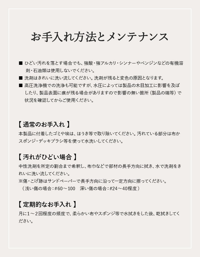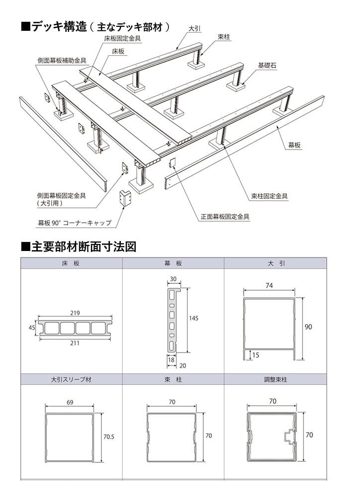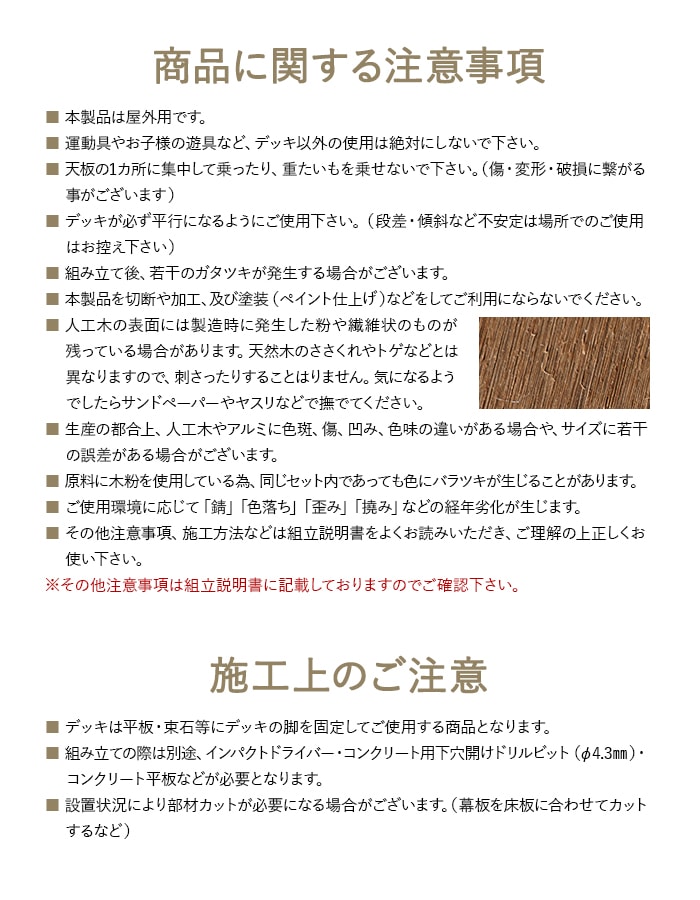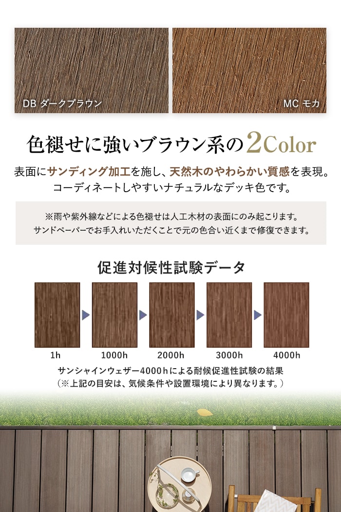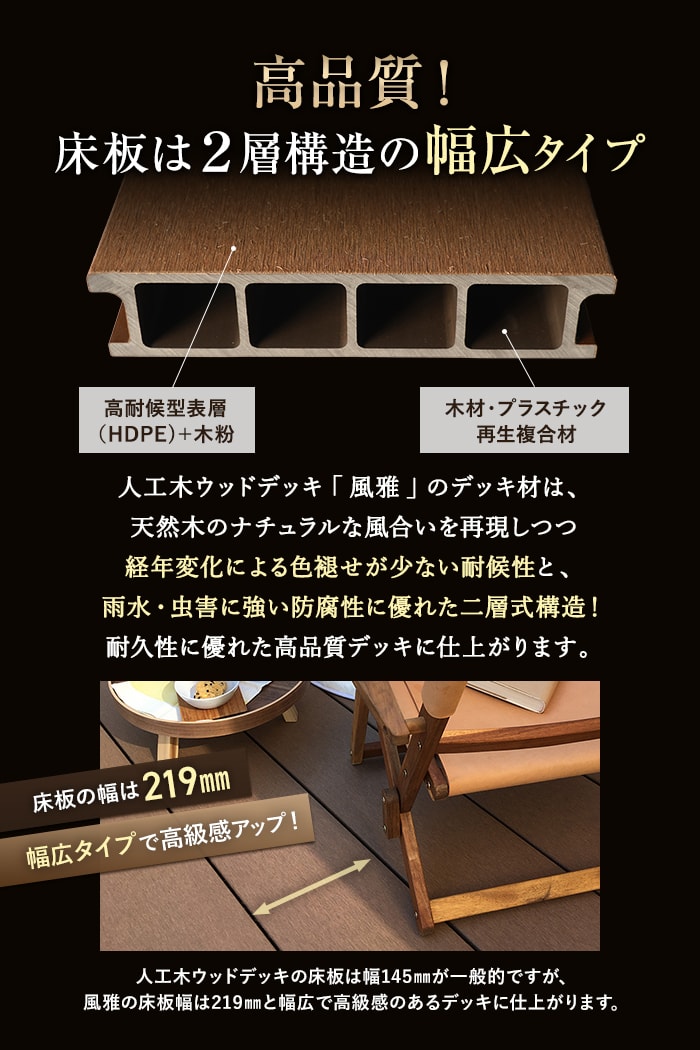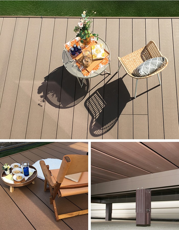 デッキ材:木材・プラスチック再生複合材、高耐候型表層(HDPE)+木粉