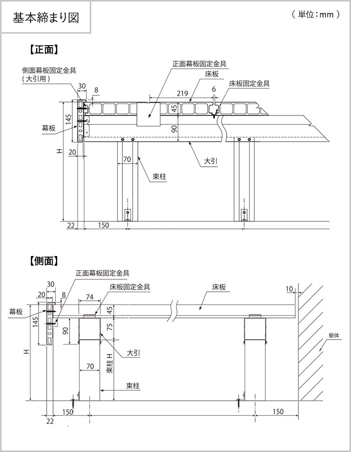 床板仕様:2層構造、サイドスリット有(専用固定金具での間接ビス止め工法)