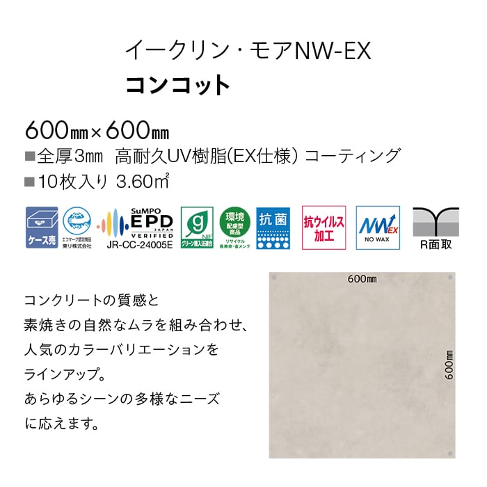 フロアタイル 東リ イークリン・モアNW-EX コンコット 600×600×3mm 10枚入