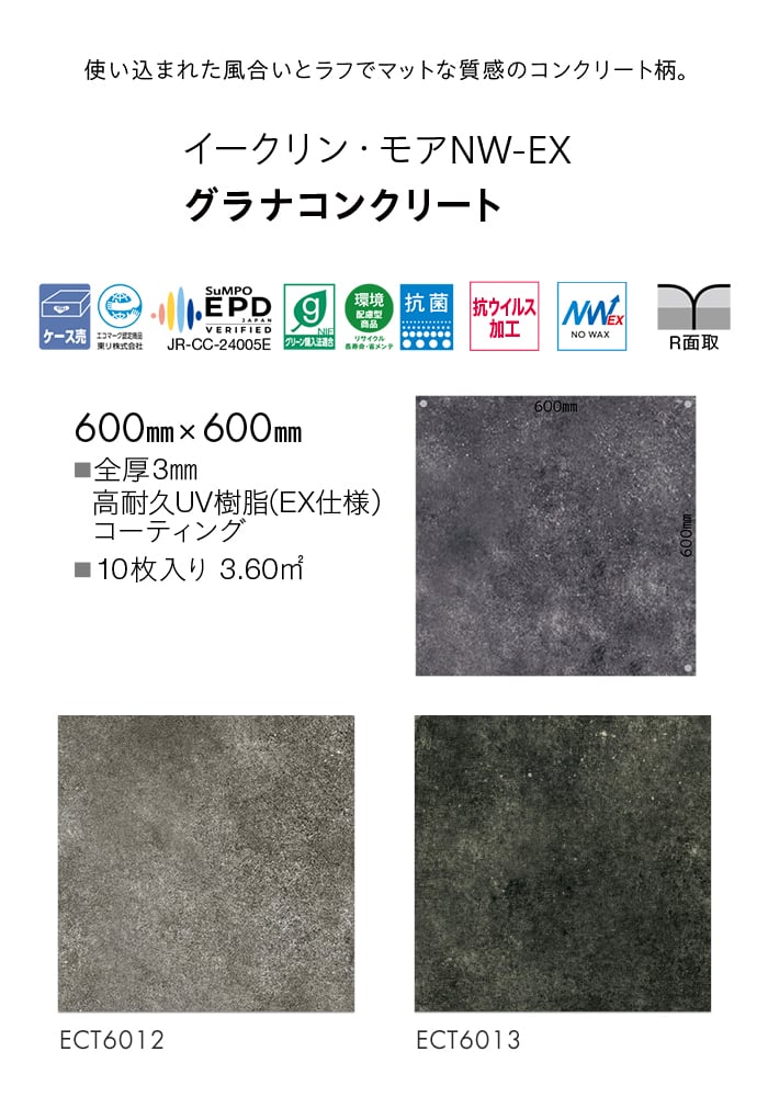 フロアタイル 東リ イークリン・モアNW-EX グラナコンクリート 600×600×3mm 10枚入
