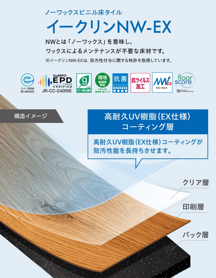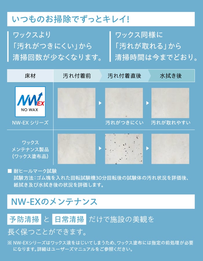 ○NO WAX EX:長期間ワックスメンテナンスが不要な床材です。日常清掃だけで、永く美観を維持できます