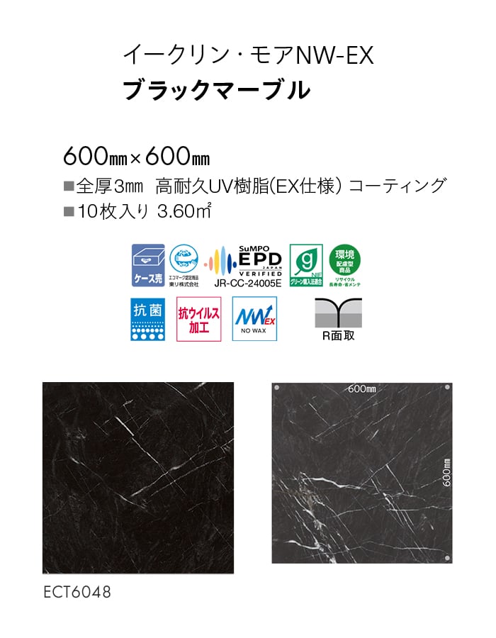 フロアタイル 東リ イークリン・モアNW-EX ブラックマーブル 600×600×3mm 10枚入