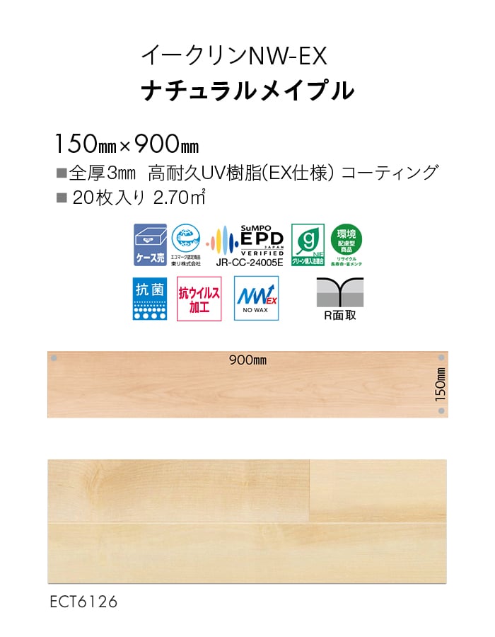 フロアタイル 東リ イークリンNW-EX ナチュラルメイプル 150×900×3mm 20枚入