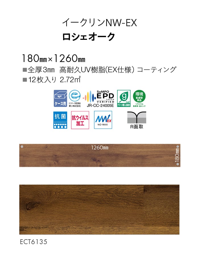 フロアタイル 東リ イークリンNW-EX ロシェオーク 180×1260×3mm 12枚入