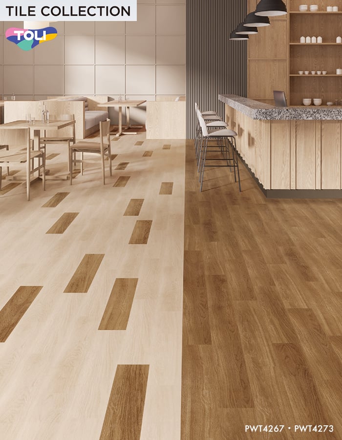 豊富な色柄と多様なサイズ。リアルな木目柄プリントタイル。エコマーク認定商品。