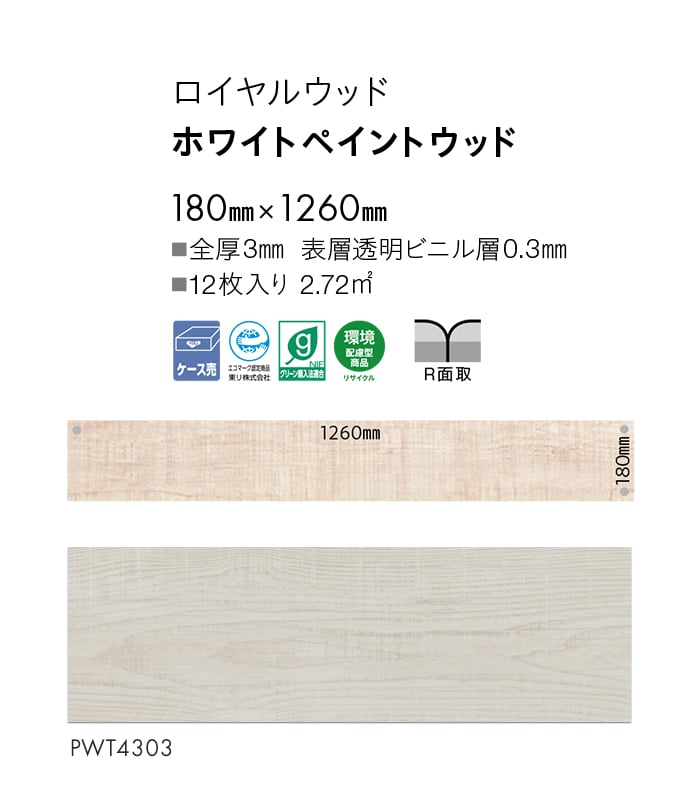 フロアタイル 東リ ロイヤルウッド ホワイトペイントウッド 180×1260×3mm 12枚入