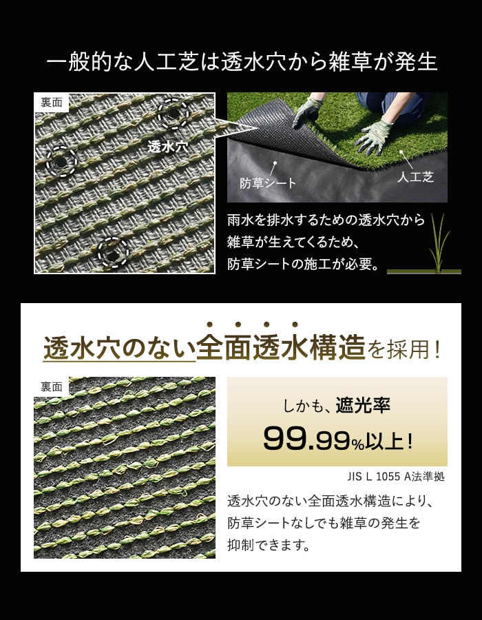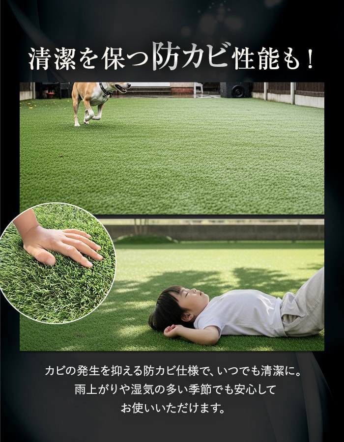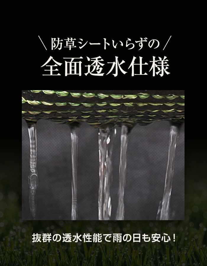 防草機能付き人工芝。水はけ抜群で雨の日も安心です。